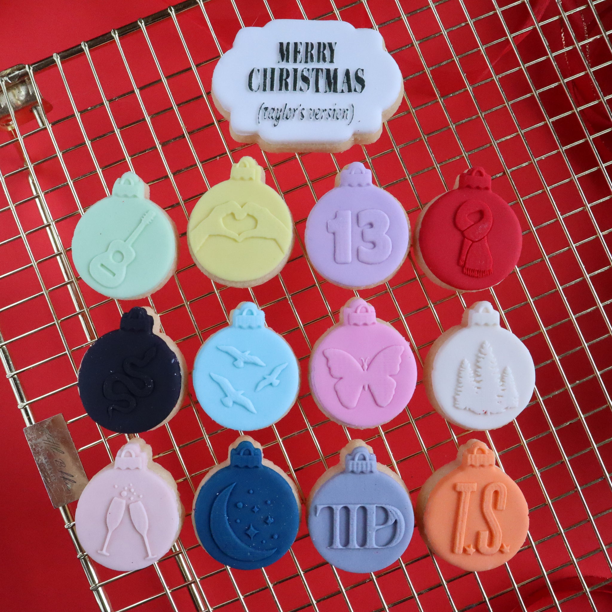 1x merry Swiftmas & 12x Mini Baubles in the eras theme with glitter.
